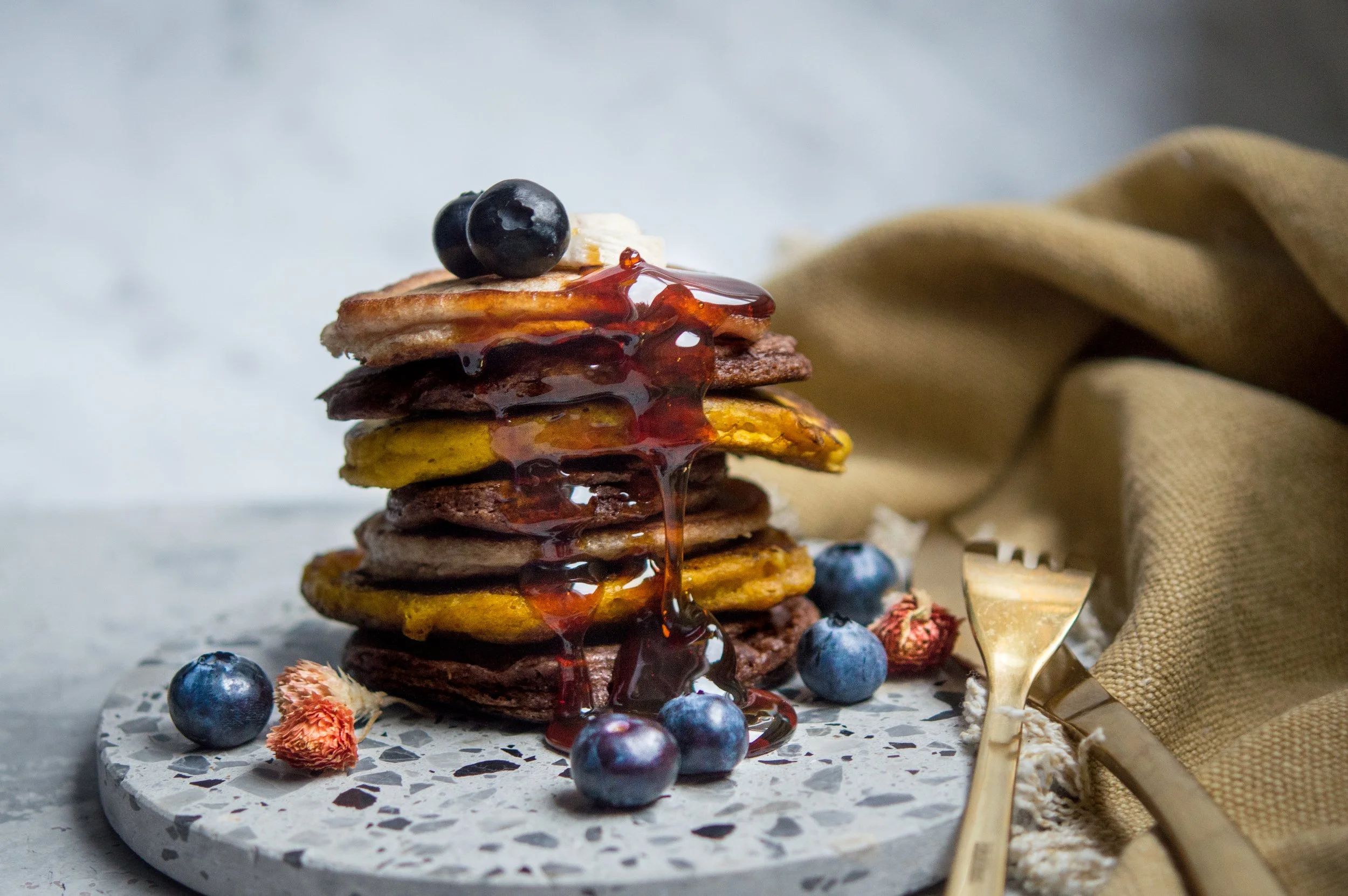 We made flapjack pancakes, also known as Dutch pancakes, and I decided to have some fun by colouring some batter using cocoa powder, turmeric and paprika. Perhaps an unusual choice for a breakfast pancake, but curiosity won , and the results were surprisingly good. You can, of course, substitute these with sweeter flavourings if you prefer. That said, the cocoa powder version is definitely my favourite.