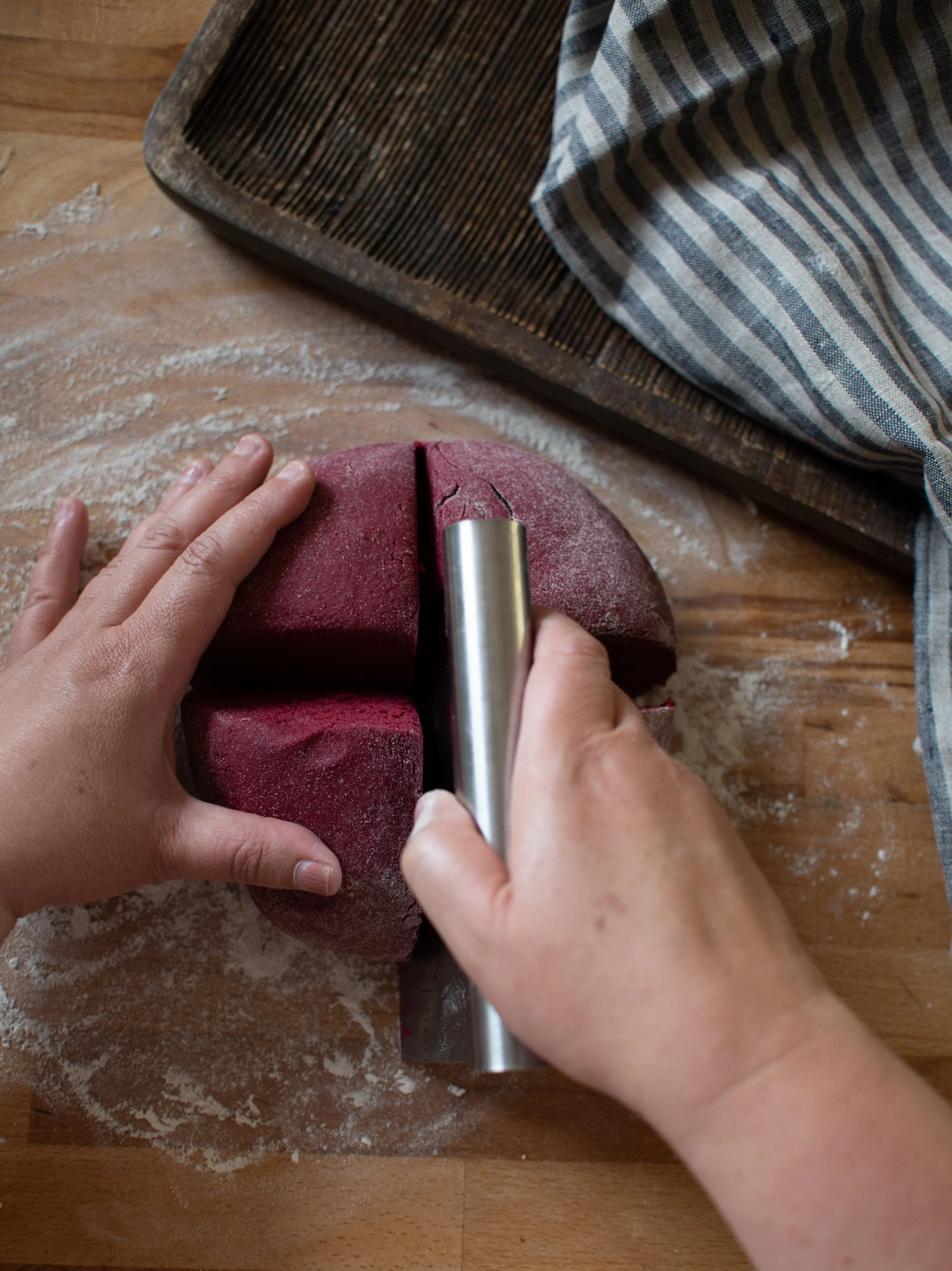 If you’re using beetroot juice instead of powder, replace some of the water with milk. Milk has a pH of around 6.5 due to its lactic acid. Ideally, you want the dough to reach a pH of 4–5, where beet juice appears bright bluish‑red. At pH 5–7, it shifts toward blue‑violet.